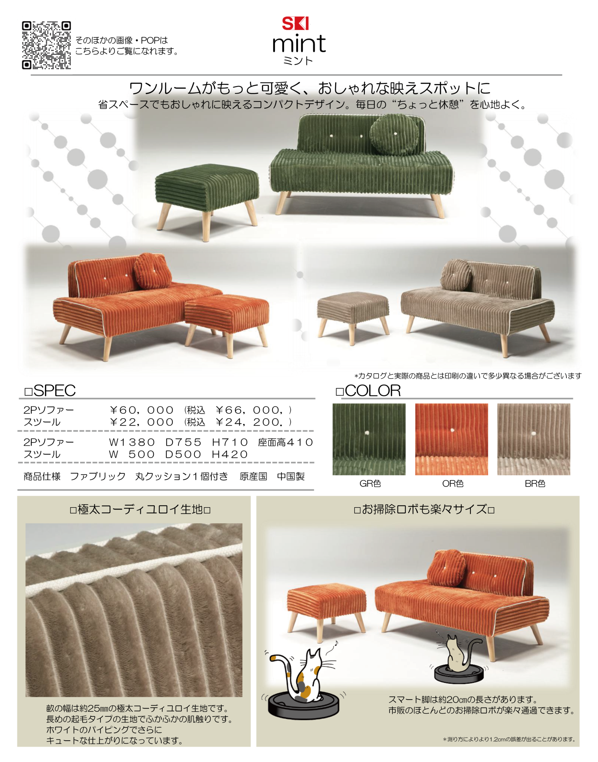 mint (ミント) 2人掛けソファ+スツール - ワンルームにぴったり!極太コーデュロイのコンパクトソファ