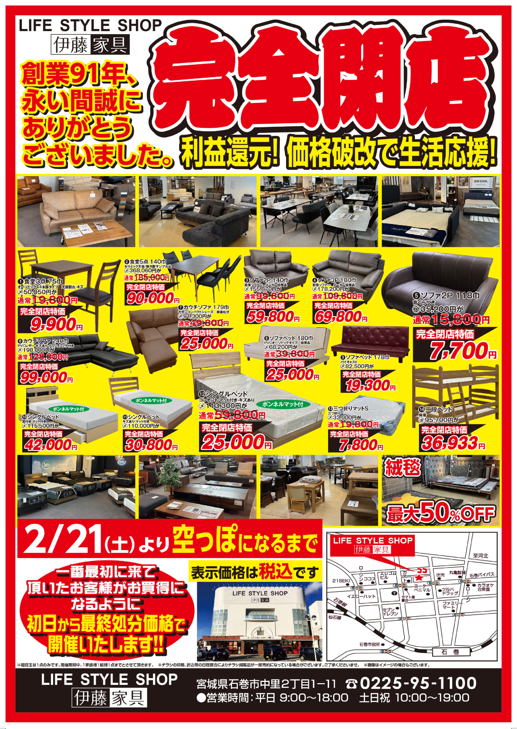 創業以来91年、石巻地域において家具専門店の廃業・閉店が相次ぐ中、地域で唯一の家具専門店として、何とか地域のお客様のために営業を続けてまいりましたが、近年の店舗施設の老朽化、ならびに物価高騰等の経営環境の変化を受け、今後も安定した店舗運営を継続することが困難となり、誠に残念ではございますが、このたび歴史の幕を閉じる決断に至りました。